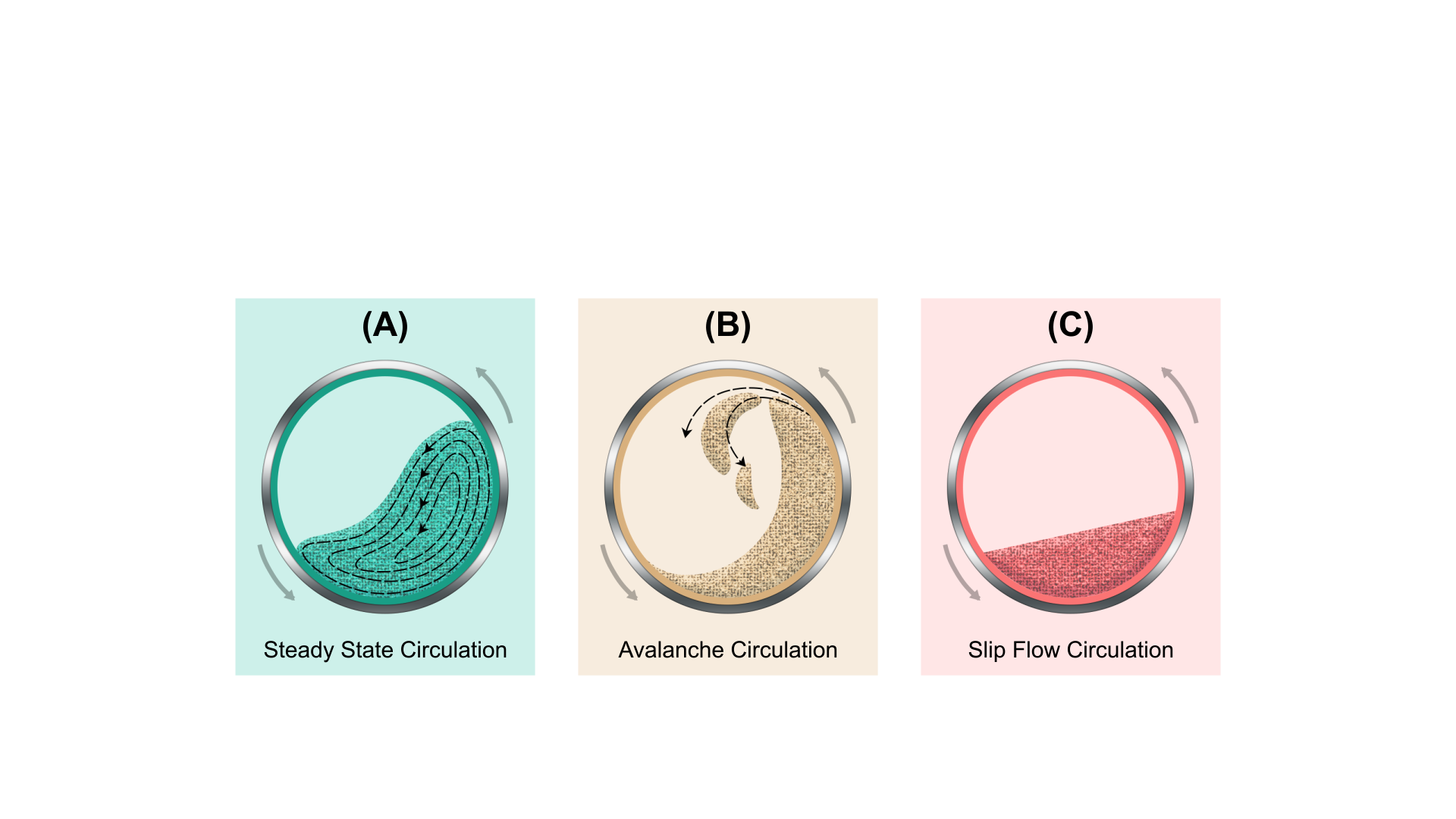 Slip flow is a flow pattern that arises due to low frictional forces between a highly polished mold surface and the powder particles. When the mold begins to rotate, the powder bed is initially lifted, forming an angle beyond which the frictional force cannot support the mass. At this point, the entire bed slides down along the mold surface. This flow pattern is particularly evident when the powder particles are disc-shaped and possess high packing densities. Slip flow results in increased porosity, poor powder mixing, and compromised heat transfer. To mitigate these issues, selecting powders with suitable shapes is essential. Furthermore, the mold surfaces can be enhanced by sandblasting using 100–200 mesh particles, thereby improving the overall flow characteristics.