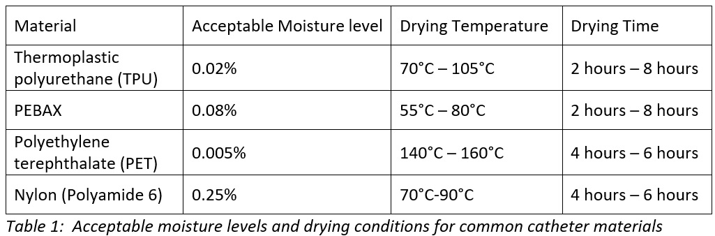 The presence of moisture within the extruder can result in the degradation of certain materials; polymers such as thermoplastic polyurethanes and polyethylene terephthalates are particularly susceptible to depolymerization when moisture is present, especially at elevated temperatures. Consequently, drying polymer pellets, which is often the initial step in most extrusion processes, is a crucial phase in catheter extrusion. Within the dryer, hot dry air is introduced at the bottom of the hopper that contains the resin, allowing it to flow upward through the pellets and effectively removing moisture along its path. The hot, moist air exits from the top of the hopper and is initially directed through an after-cooler, as it is more efficient to extract moisture from cooler air than from hot air. The resulting cool, moist air is subsequently passed through a desiccant bed. Ultimately, the cool, dry air that emerges from the desiccant bed is reheated in a process heater and recirculated through the same procedures in a closed-loop system. The extent of drying is significantly influenced by the type of material utilized in the extrusion process. Insufficient drying of certain materials may lead to degradation within the extruder, while excessive drying may result in thermal degradation of other materials. The drying specifications for various plastics are typically determined by the manufacturer of the plastic.